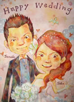 プレゼント用の似顔絵や結婚式の似顔絵ウェルカムボードをはじめ、オーダーメイドの似顔絵をさまざまなタッチの中から選ぶことができ、世界で一枚の似顔絵が作れます。