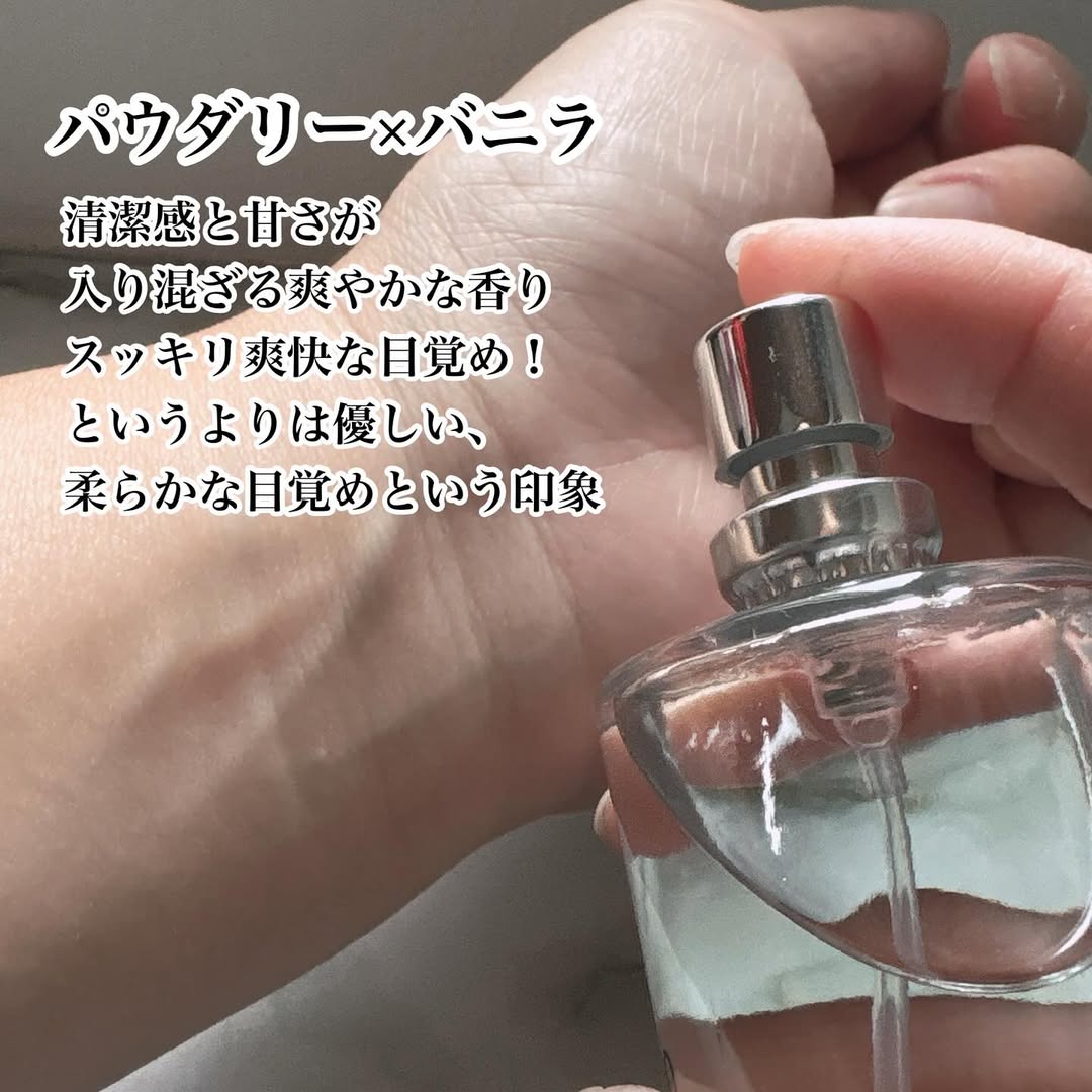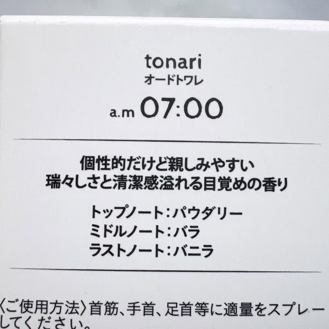 “時間”から連想される香り【tonari オードトワレ 30ml am07:00】のご紹介だよ☺️ 私が使用したのは『am07:00』 瑞々しさと清潔感が溢れる目覚めの香り ⬇️香りの構成はこんな感じ⬇️ トップノート:パウダリー ミドルノート:バラ ラストノート:バニラ まず最初にパウダリーのあっさりとした香りがきます。その後は徐々に甘くなっていくような感じ。パウダリーとバニラをしっかり感じる香りだよ😍 バラの香りは控えめかな? こってり甘くなりすぎないです😌 スッキリ爽快な目覚め‼️✨️というよりは、柔らかな光の中で目覚めるような、、優しい朝のようなイメージでした☀️ オードトワレ、ということで香りの持続性は2時間くらいかなぁ。しっかり香る、ではなくほわっと柔らかに香りを纏う感じ🥰 すごく好きな香りだから、オードパルファムVer.もぜひぜひ欲しい♡♡ #PR #ツーウェイワールド株式会社 #tonari #トナリ #トナリ香水 #フレグランス #オードトワレ #香水 #プチプラ #プチプラ香水 #monipla #2wayworld_fan