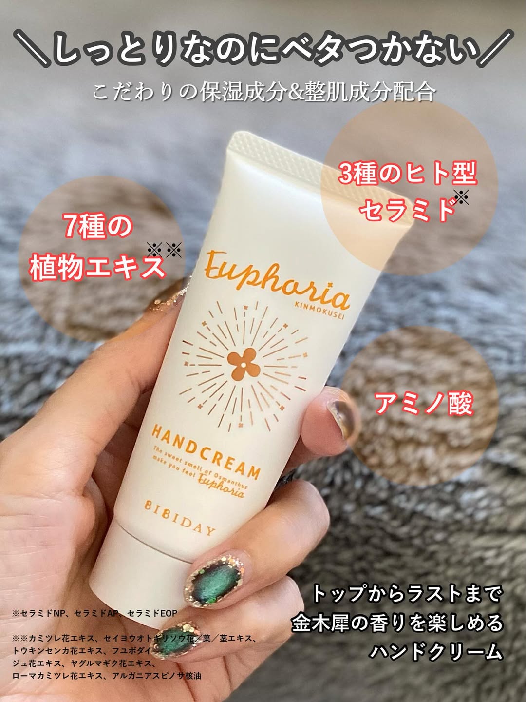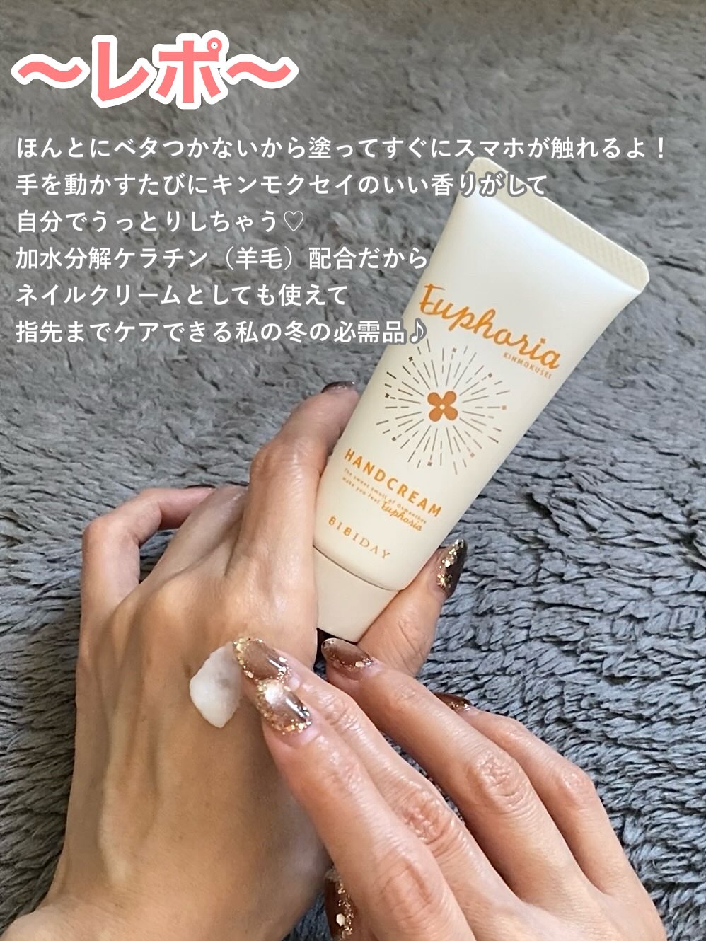 【BIBIDAY キンモクセイハンドクリーム】 もうすぐ金木犀の季節だね🏵️ お散歩するとどこからともなく香ってくる金木犀の香りに 癒された経験、1度はあるよね🥰 そんな体験がお家でできちゃう ハンドクリームを紹介するよ😉 ⭐︎★⭐︎…‥⭐︎★⭐︎‥…‥⭐︎★⭐︎‥…‥⭐︎★⭐︎‥…⭐︎★⭐︎ BIBIDAY Euphoria キンモクセイ ハンドクリーム ⭐︎★⭐︎…‥⭐︎★⭐︎‥…‥⭐︎★⭐︎‥…‥⭐︎★⭐︎‥…⭐︎★⭐︎ こだわりの保湿成分&整肌成分配合で しっとり潤うのにベタつかない✨ 加水分解ケラチン(羊毛)も配合されてるから ネイルクリームとしても使えるよ😍 何より1番のポイントはやっぱり香り💕 トップからラストまでキンモクセイ一択✨ 30gのコンパクトサイズだから 持ち運びにも便利で いつでもどこでも金木犀に包まれることができるよ🥰 この秋のイチオシのハンドクリーム 是非試してみてね😘 最後の動画にネイリストの私が毎日寝る前にしてる ハンドマッサージのやり方を伝受しちゃってるから 良かったらみてね😉 @bibiday_official #PR #ツーウェイワールド株式会社 #BIBIDAY #金木犀 #きんもくせい #金木犀の香り #乾燥対策 #ハンドクリーム #ハンドクリームマニア #monipla #2wayworld_fan
