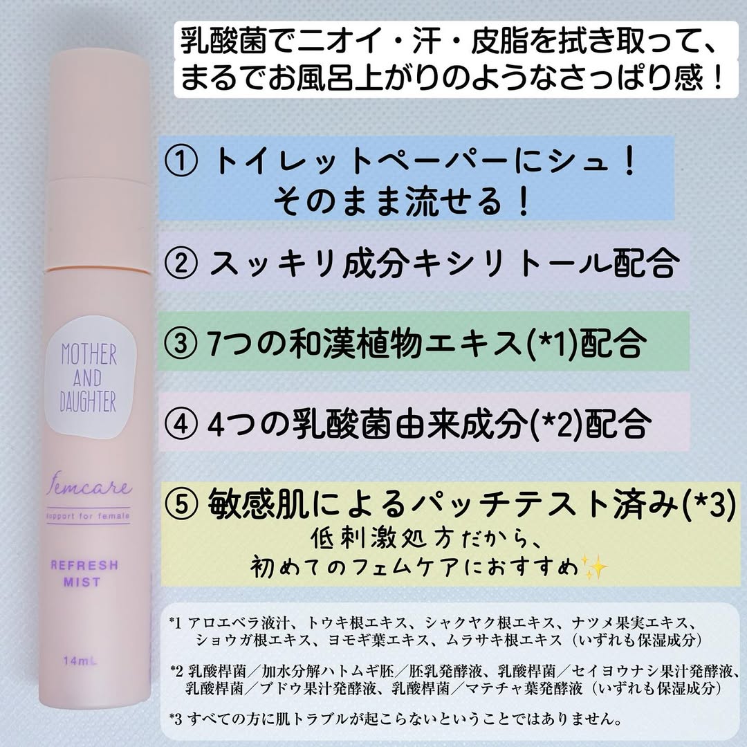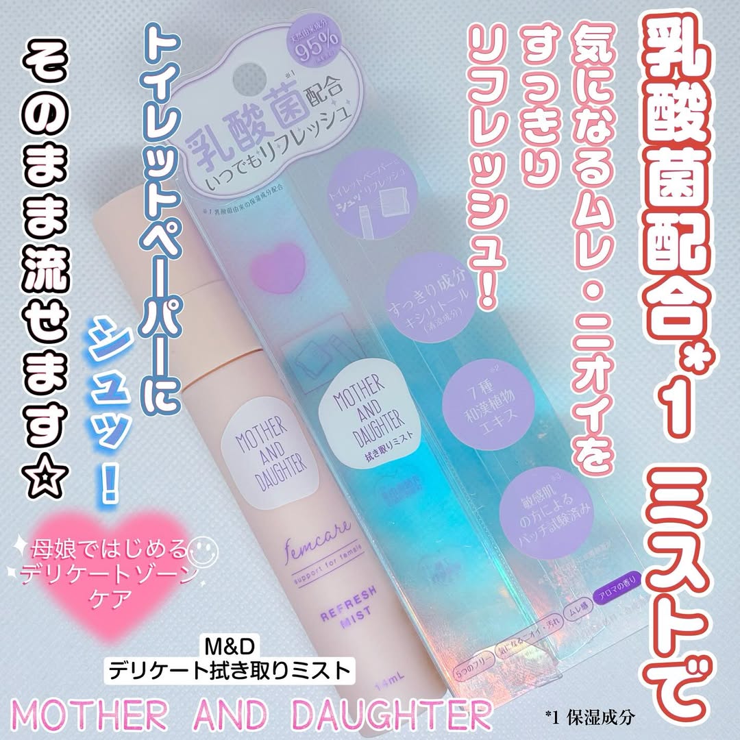 ムレや臭い等の悩みを持っていても相談しにくい子もいるかも💦マザーアンドドーターさんのフェムケア商品は前にモニターさせてもらった泡ウォッシュや今回モニターさせてもらった拭き取りミスト。そして保湿にいいオイルインミストがあります❣️