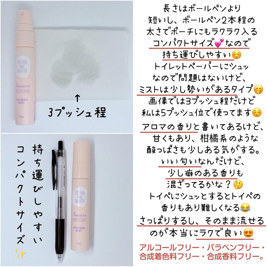 ティッシュにスプレーして使うので、そのまま流せるのも良い💕流せるデリケートゾーンウェットティッシュを使ってるけど、場所によっては水圧が弱いトイレなんかもあってウェットティッシュを流すのが少し怖かったり🥶でもこれは備え付けのトイレットペーパーにスプレーするからその心配がないのがとても良い🙆🏻♀️