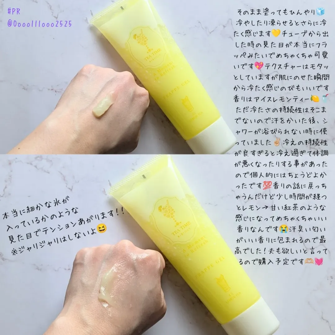 #PR . . . . . moniplaファンクラブ様を通して BIBIDAY様 ▶ @bibiday_official よりご提供いただきました☄️ BIBIDAY・TEATIME フラッペジェル 150g アイスレモンティーの香り フラッペ⁉️と思うような見た目👀カワイイ💕 テクスチャーはモタッとしていますが 肌にのせた瞬間からひんやり冷た〜い🧊 のびがいいのが嬉しいっ✨ 香りはもちろんアイスレモンティー🍋🥤 時間が経つと更に甘いいい香りに😍 (この甘い香りが最高に好きっ💖) ただ冷たさの持続性はあまりないので 汗かいた後やシャワーがあびられない環境の時 そして汗の匂いが気になる時に使っていました🤭 個人的に冷えの持続性が強いと 体調が悪くなってしまうのでちょうど良かったです👌🏼 夫も使いたいーーと言うので使ってもらったら 🥰<えっ!これいい👍🏼買おう! と気に入ったので購入予定です✌🏼 素敵なアイテムとの出会いを ありがとうございました❣️ #PR #ツーウェイワールド株式会社 #BIBIDAY #TEATIME #フラッペジェル #暑さ対策 #冷感グッズ #冷感コスメ #コスメレビュー #新作コスメ #ボディケア #ボディジェル #monipla #2wayworld_fan