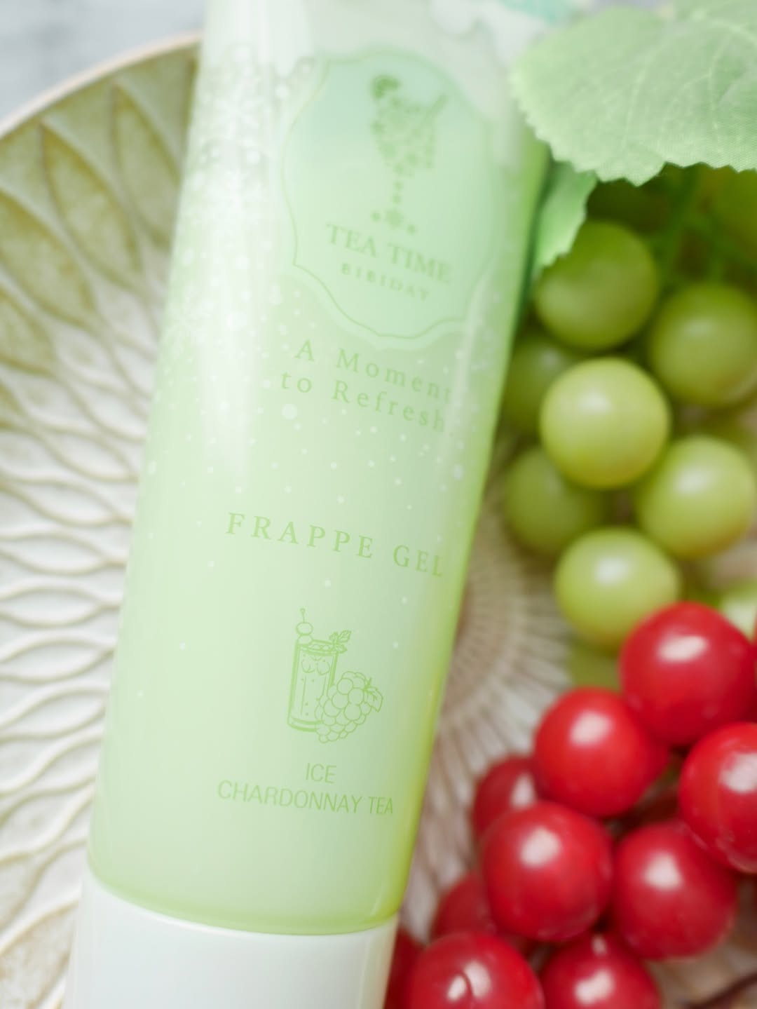 初恋のような甘くみずみずしい白桃ティーの香りで、心ときめくひとときを。 フレッシュなフルーツティーの香りで、いつでもティータイム気分が味わえる冷感ボディジェル。肌なじみが良く、軽やかで伸ばしやすいぷるぷるジェルが特徴です。べたつかないさらっとしたテクスチャーで、じっとりした夏の暑さ対策に最適! 冷感成分(※1)配合でそのままでもひんやりですが、冷蔵庫や冷凍庫に入れるとさらに冷たい感覚をお楽しみいただけます。お風呂上がりやレジャー後などの火照ったお肌のクールダウンにもおすすめです。