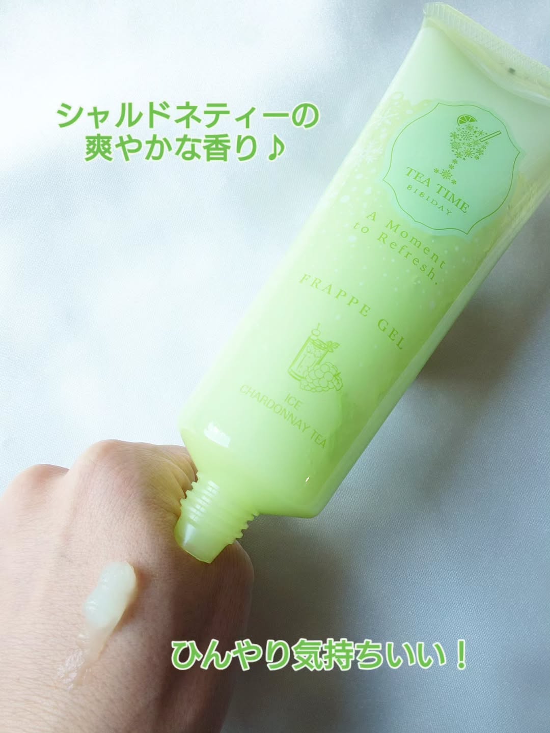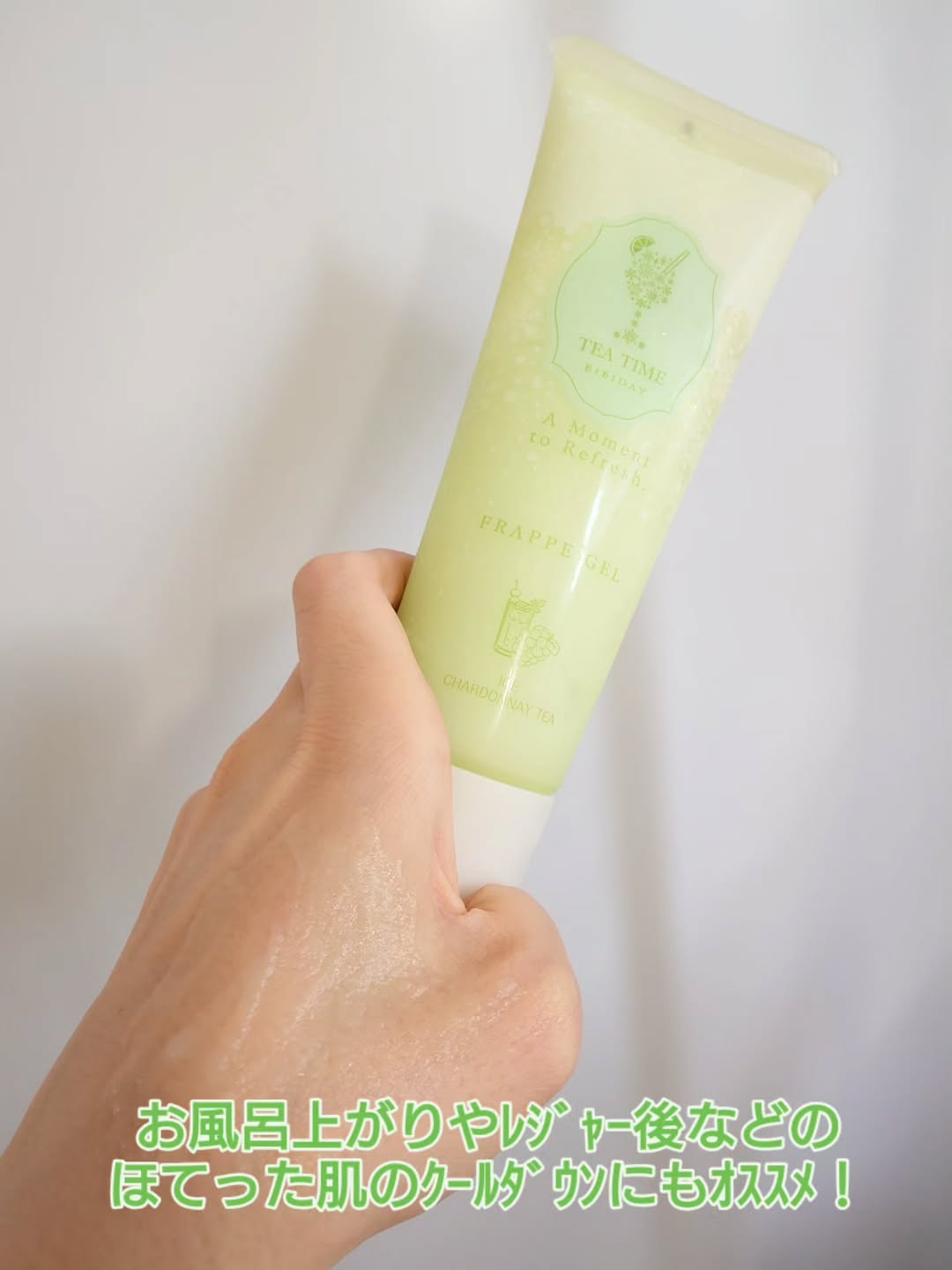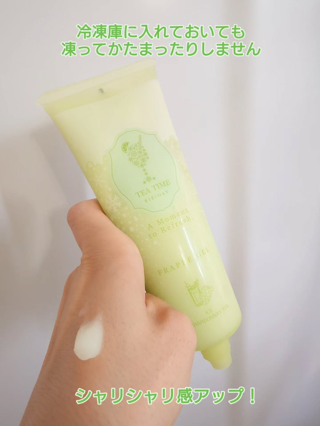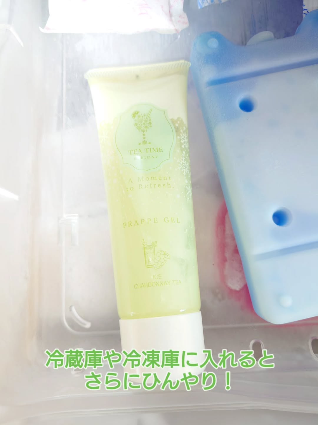 初恋のような甘くみずみずしい白桃ティーの香りで、心ときめくひとときを。 フレッシュなフルーツティーの香りで、いつでもティータイム気分が味わえる冷感ボディジェル。肌なじみが良く、軽やかで伸ばしやすいぷるぷるジェルが特徴です。べたつかないさらっとしたテクスチャーで、じっとりした夏の暑さ対策に最適! 冷感成分(※1)配合でそのままでもひんやりですが、冷蔵庫や冷凍庫に入れるとさらに冷たい感覚をお楽しみいただけます。お風呂上がりやレジャー後などの火照ったお肌のクールダウンにもおすすめです。