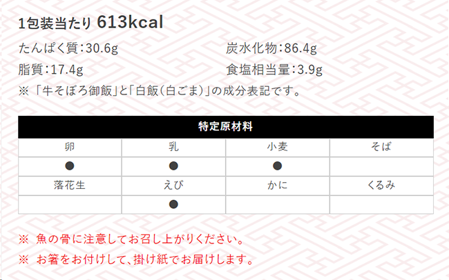 ※写真の御飯は「牛そぼろ御飯」と「白飯(白ごま)」です。