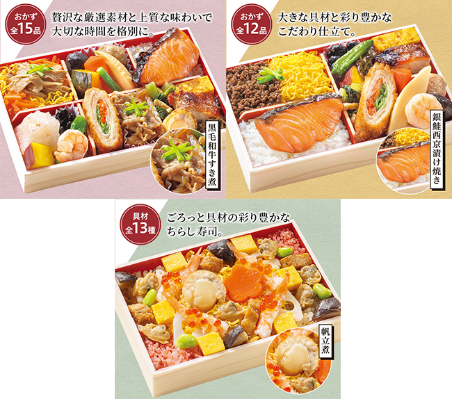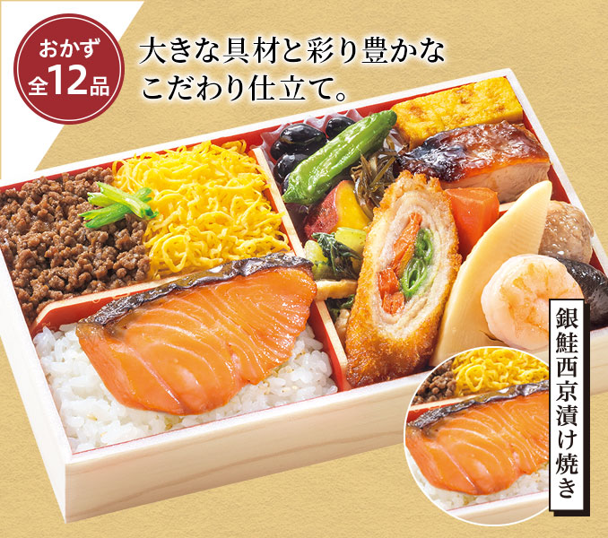 内容:銀鮭西京漬け焼き / 鶏照焼き / 厚焼玉子 / 海老甘煮 /