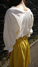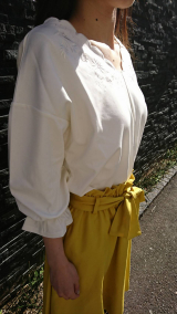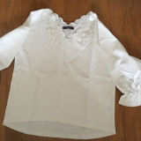 襟元に沿ってスカラ刺しゅうを施したスリーブカットソー。ブラウスとは違いカットソー生地で仕立てており、ソフトな風合いが着心地よく可愛い仕上がりです。トレンドのキャンディスリーブで袖コンシャスをプラスしたアイキャッチなデザイン。刺しゅうを生地同色なので大人っぽくコーディネートが組め、パンツやスカートまで相性抜群です。