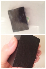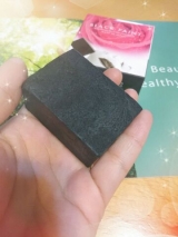 こちらは オーガニック成分で 製法されたお肌に優しい 石鹸ということで 安心して使用できました★ 箱を開けて ビックリ!!Σ(´д`) まっくろ!! 使用方法通り 40度ほどのお湯に 石鹸をつけてみると、 表面が溶けてぬるぬる してきました! 長くつけすぎると… 2014/12/26
