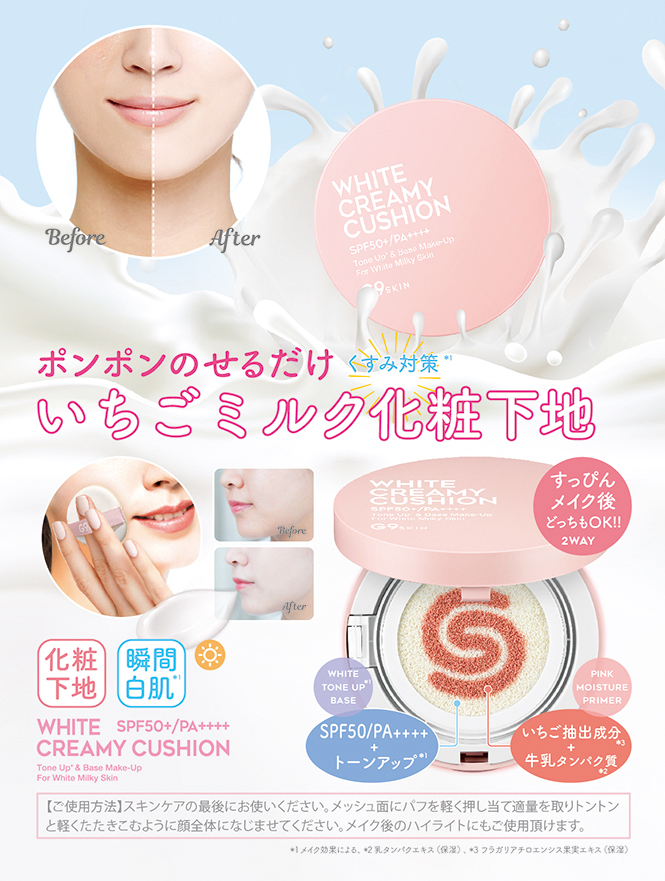 #Whitecreamycushion #G9ウユクッション #G9CUSHION #monipla #GRinc_fan 韓国発の#g9skin いちごミルク #ホワイトインクリーミークッション ご紹介させて下さいね 塗って直ぐにトーンアップ。 すっぴん・メイク前後もいつでも使え毛穴・しみ・くすみをカバーします。 トーンアップ・日焼け止め・プライマーの3役の働きをし水分エッセンスもたっぷり配合しているので保湿効果も抜群です。 高密着で化粧崩れも怖くない。 SPF50+/PA++++で紫外線もしっかりガード。 使用感🔸🔸 ピンクの容器が可愛い~ ナチュラルにトーンアップ! ツヤが出ます。 ハイライトに使用したり、 メイクの後にもポンポン お化粧直しに便利です。 #PR#レビュー#韓国コスメ#CCファンデーション#メイク動画#瞬間白肌#コスメ好きさんと繋がりたい 【定価】15g 1,800円+税 ご使用方法:メッシュ面にパフを軽く押し当て適量を取り、トントンと軽くたたきこむように顔全体になじませます。 2018/09/16
