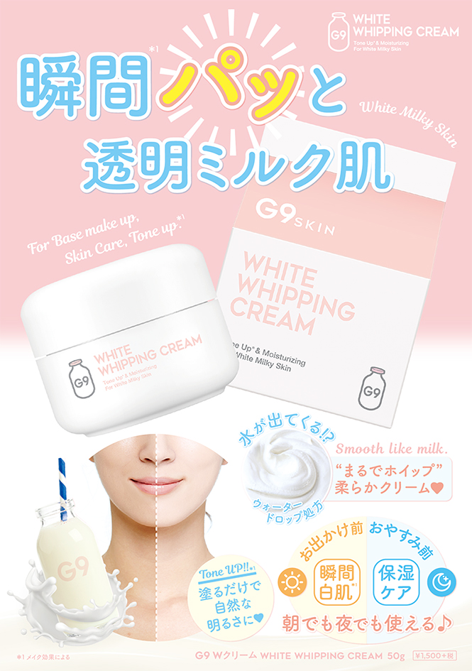 G9 WHITE WHIPPING CREAM #ウユクリーム * 塗って直ぐにトーンアップ。 話題のウユクリーム(牛乳クリーム)は、毛穴・しみ・くすみをカバーします。塗った瞬間、水が出てくるウォータードロップ処方採用で生クリームのようななめらかなテクスチャー。 牛乳タンパク質抽出物など18種類の美容成分でしっかり保湿ケア。 * ご使用方法:スキンケアの最後に適量を手に取り、お肌になじませてください。 50g 1,500円+税 ***** * 肌が水をはじく感じ。 なかなか肌に馴染まないのですが、丁寧に塗布すると、しっかり馴染んでくれます。 その後の肌触りの良いこと! 肌はワントーン明るくなるし、肌がキレイに見える! スキンケアの最後に使うのですが、その後、化粧するのが勿体なく感じます。 サラッサラの肌触り♪ 牛乳パックみたいな外箱も可愛いし、プレゼントにも良い♪と思いました♪ * #G9ウユクリーム #G9CREAM #monipla #grinc_fan #PR #GR株式会社 #G9ウユクリーム #G9CREAM #monipla #grinc_fan 2018/09/18