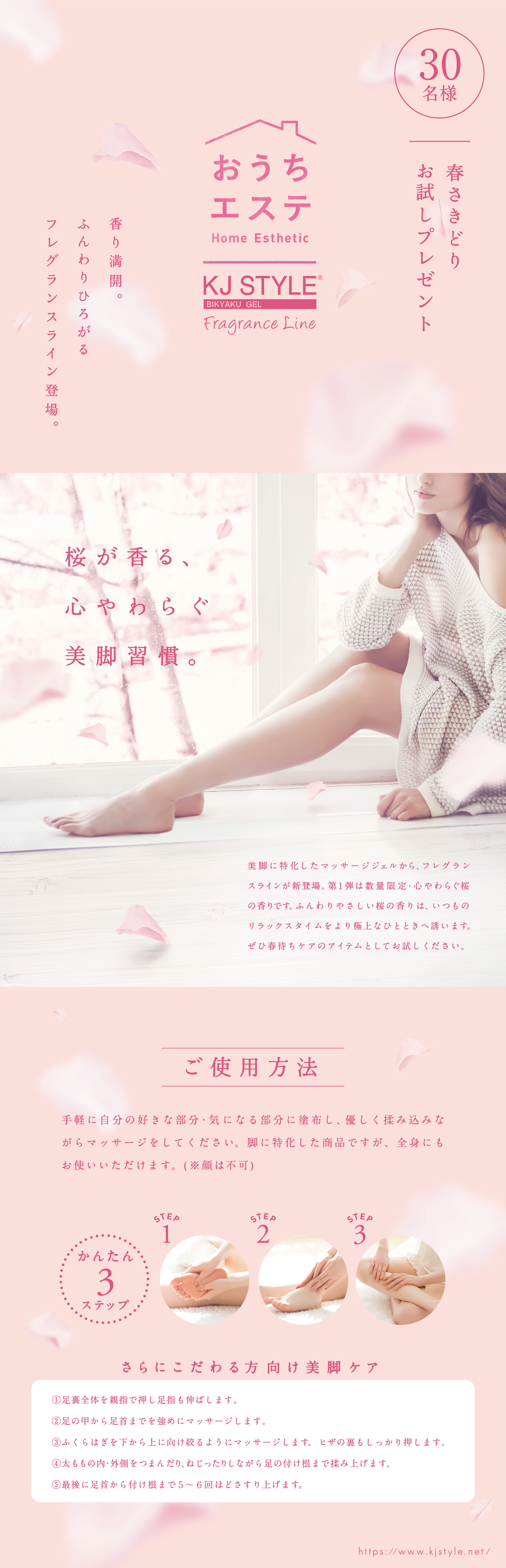 美脚に特化したマッサージジェルから、フレグランスラインが新登場。第一弾は数量限定桜の香り。ふんわりとやわらかに香る桜の香りで、いつものマッサージタイムを心やわらぐ上質な時間へ誘います。また、引きしめ成分・うるおい成分・白肌成分・ツヤ肌成分をたっぷり配合した、理想の美脚へと導くマッサージジェルです。 独自配合の美容成分がお肌をキュッと引きしめてうるおいを与えます。
