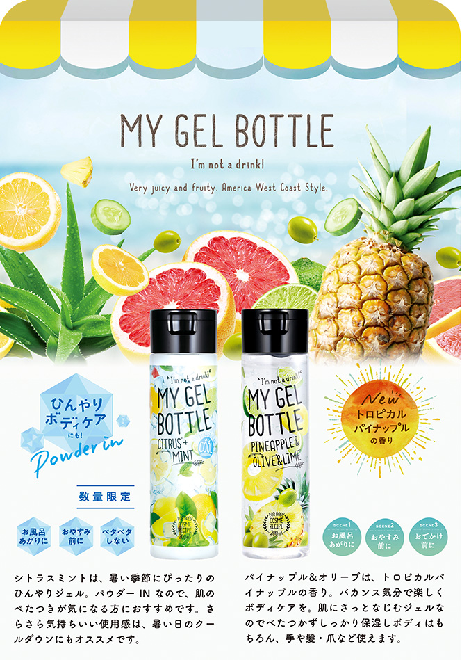 MY GEL BOTTLE シトラスミント/パイン&オリーブ 人気のマイジェルボトルにパイナップル&オリーブが仲間入り。トロピカルな香りで楽しいボディケアをお楽しみください。そして、暑い季節にぴったりのひんやりシトラスミントも期間限定で発売開始。さらさらパウダーINなので、肌のべたつきが気になる方におすすめです。 レビュー数 : 49 |