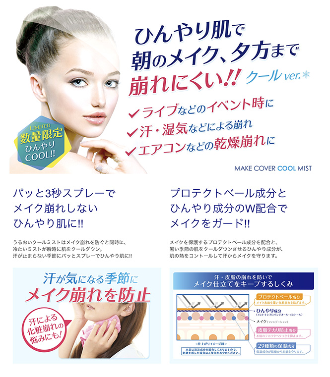 【数量限定]メイクカバーうるおいミストのクールバージョン!! LDK the Beauty で「フィックスミスト部門」最高評価のA+を取得した唯一の商品です。 ひんやり引きしめてベタつかずテカリにくい肌へ! メイクの上から3秒スプレーで、メイク仕立てを長時間キープ! 皮膜成分、保湿成分、皮脂抑制成分配合で、乾燥によるメイク崩れ・皮脂によるメイク崩れをWブロックします。 ひんやりシトラスの香り。 レビュー数 : 50 |