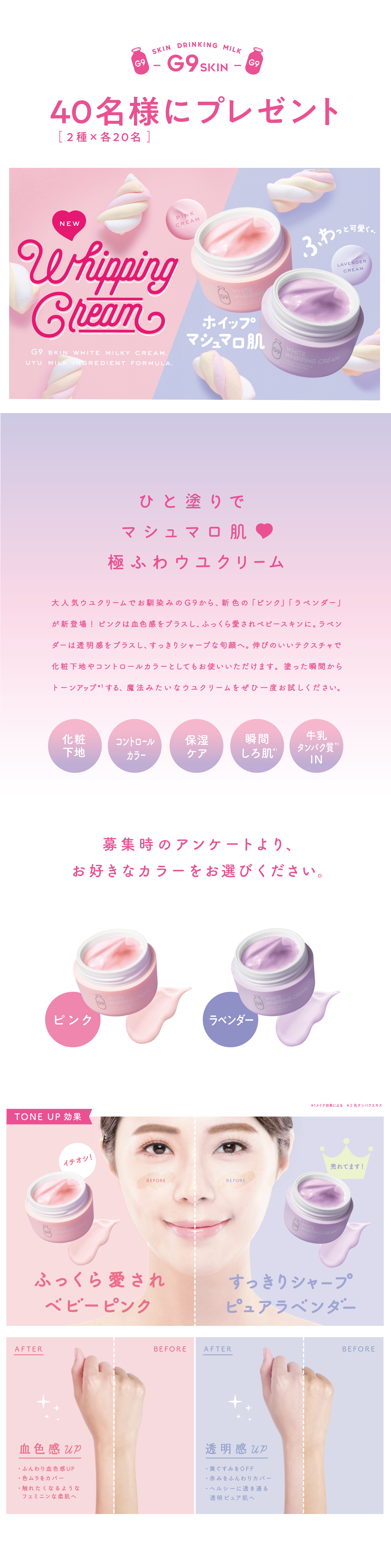 WHITE WHIPPING CREAM ピンク(ウユクリーム) ふっくら愛されピンクのトーンアップウユクリーム。 塗って直ぐにトーンアップ。話題のウユクリーム(牛乳クリーム)は、毛穴・しみ・くすみをカバーします。塗った瞬間、水が出てくるウォータードロップ処方採用で生クリームのようななめらかなテクスチャー。 牛乳タンパク質抽出物など18種類の美容成分でしっかり保湿ケア。 レビュー数 : 45 |