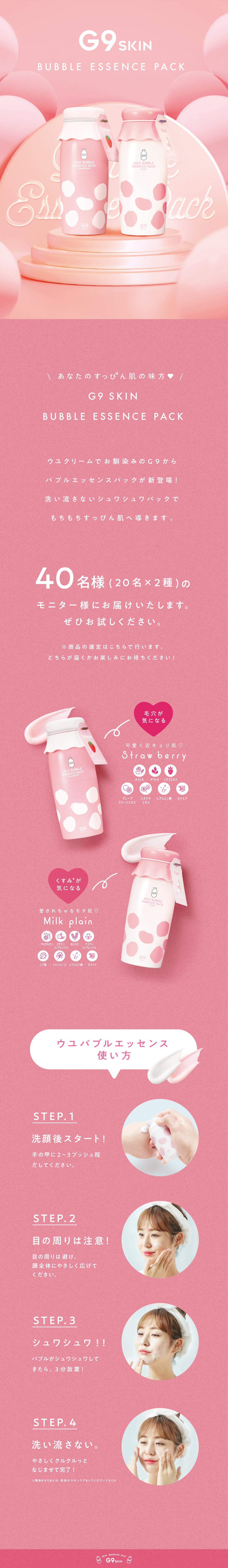 レビュー第24弾🦋 今回紹介するのは、 『G9スキン ミルクバブルエッセンスパック』 種類は2種類ありますが、私は毛穴が気になる人向けのストロベリーをお試しさせて頂きました🍓 なんとこのパック洗い流さないタイプのものなんです😲 洗顔後の肌に優しく広げるとすぐに泡がシュワシュワしてきてモコモコになります‼︎ モコモコになったら3分程度放置した後にくるくる優しくマッサージしてお肌に馴染ませて完了‼️ 超簡単に楽しくスキンケアできるのでとてもオススメです☺︎ ・ ・ ・ #G9SKIN #G9MILKBUBBLEESSENCEPACK #G9バブルパック #monipla #grinc_fan 2020/04/24
