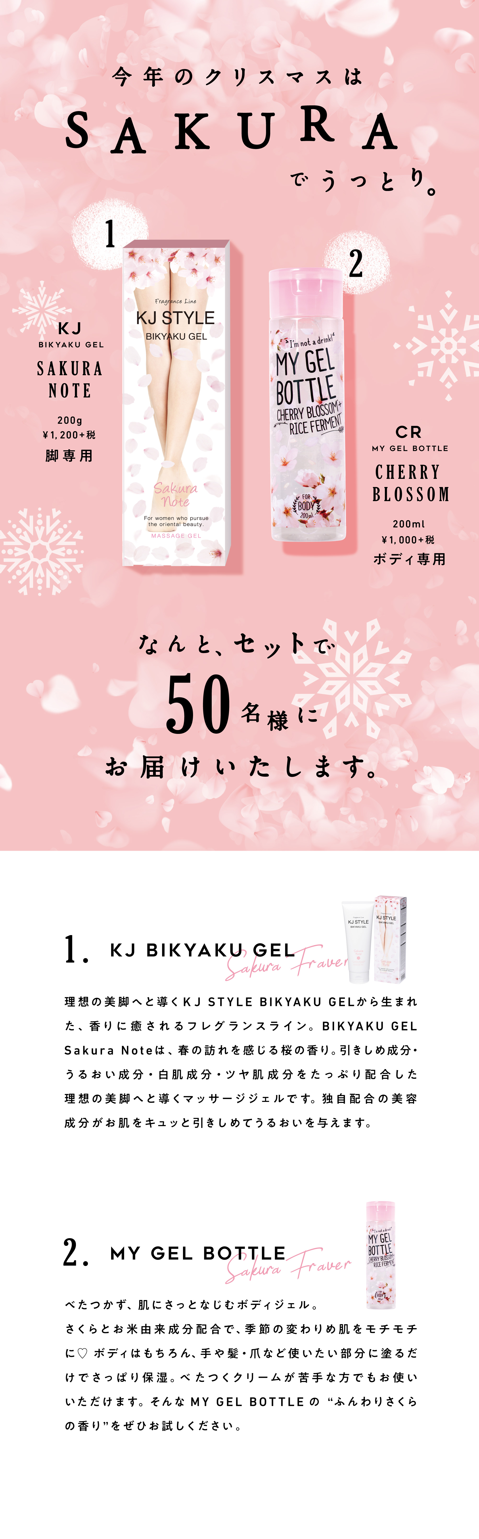 冬も乾燥知らずなBODY🌟 GR株式会社 KJ STYLE フレグランス サクラノート 200g ¥1,200+税 と MY GEL BOTTLE さくら 200ml ¥1,000+税 のご紹介です🌸✨ ◎KJ STYLE フレグランス サクラノート◎ は、肌にゆっくり浸透するジェルタイプなので、 時間のある時にゆっくりマッサージしながら塗り込みます❣️ 桜のふんわりした香りに癒されながら、 足元をしっかり引き締めてくれます🙌✨ 美脚に特化されたマッサージジェルで、 独自配合の美容成分がお肌をキュッと引きしめてうるおいを与えてくれます💗 引きしめ成分 うるおい成分 白肌成分 ツヤ肌成分 がたっぷり配合😍 理想の美脚へと導いてくれます👍❣️ 厳選成分13種と保湿成分11種も配合されていて、 パラベン・鉱物油・着色料はフリーなので、 足がツルツル💕 マッサージって、自分でするのはちょっと面倒でしたが、香りも良いので、マッサージする時間が楽しくなりました🌸 ◎MY GEL BOTTLE (マイジェルボトル) さくら◎ は、手に取った時にはジェルなのに、 肌に伸ばすと化粧水のようになり、べたつかず、さ サラッと馴染んでくれるタイプ🥰 なので、マッサージとかじゃなく、お風呂上がりやら、朝の着替え前なんかの保湿にオススメです💡 さくらとお米由来成分配合なので、サラッとした使い心地なのに、バスタイムまでモチモチ肌をキープ💗 粉吹き知らずの足元になれて、湯船の中で足を擦り合わせた時のツルツル感は、自分の足じゃないようでした😆❣️ ボディはもちろん、手や髪・爪など使いたい部分に塗るだけでさっぱり保湿してくれます💫 べたつくクリームが苦手な方にもオススメ👌 2020/01/16