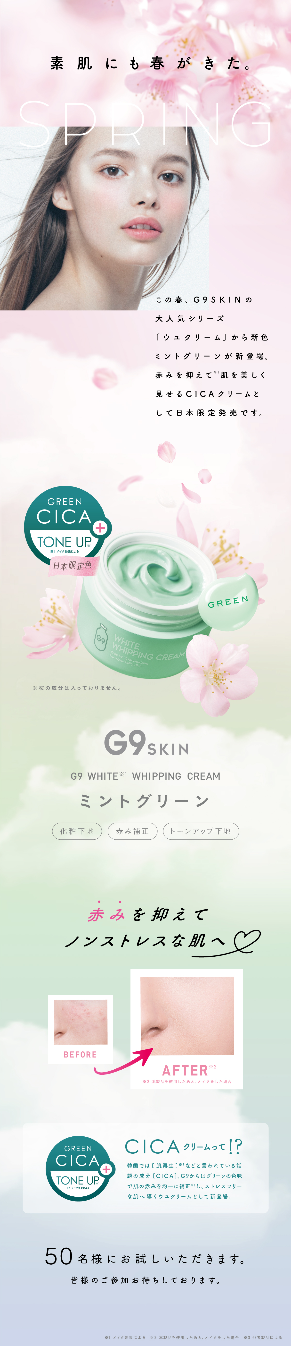 . ♡WHITE WHIPPING CREAM ミントグリーン♡ . 赤みを抑えて肌を美しく見せる CICAクリームとウユクリームが合わさった トーンアップクリーム❤️ . 韓国では「肌再生」などと言われている 話題の成分「CICA」✨ G9からはグリーンの色味で肌の赤みを均一に補正し ストレスフリーな肌へ導くウユクリームが 日本限定色として期間限定販売💗 . 27種類の美容成分で、 瑞々しい透明感のある肌に仕上げます☘️ . ◎赤みフルカバー 赤み・ニキビ跡を瞬間カバー! ノンストレスな肌にリセット✨ ◎素肌みずみずしく 素肌がキレイと思わせる安定のトーンアップ力! . . 生クリームのようななめらかなテクスチャー💕 クリームが水のように変化するウォータードロップ処方が 柔らかくて気持ちいいです☺️ . スっとする自然な香りがほんのりします🌿 . 肌にしっかり密着するので、薄づきなのに トーンアップ効果が😍 少量でキレイになじんで赤みも抑えてくれます! (クリームは少量で◎🙆♀️) . ベタつきがなく軽いつけ心地なのに カバー力もあるところがお気に入り🥺💕 . 牛乳パックのような箱にコロンとした丸い容器が パケ買いしたくなる可愛さです☺️ 韓国のスキンケア用品ってほんとかわいい✨ . . 肌をトーンアップさせたい方や 赤み、くすみ、黒ずみ、毛穴が気になる方に おすすめです😉 . 是非チェックしてみてください🌸 . ∞----------------------∞ WHITE WHIPPING CREAM ミントグリーン 50g ¥1,500+tax 化粧下地/赤み補正/トーンアップ下地 . . #PR #GR株式会社 #G9クリームミントグリーン #CICACLEAM #CICA #トーンアップクリーム #G9SKIN #肌の赤み対策 #G9ウユクリーム #コスメ好きさんと繋がりたい #monipla #GRinc_fan 2020/04/14