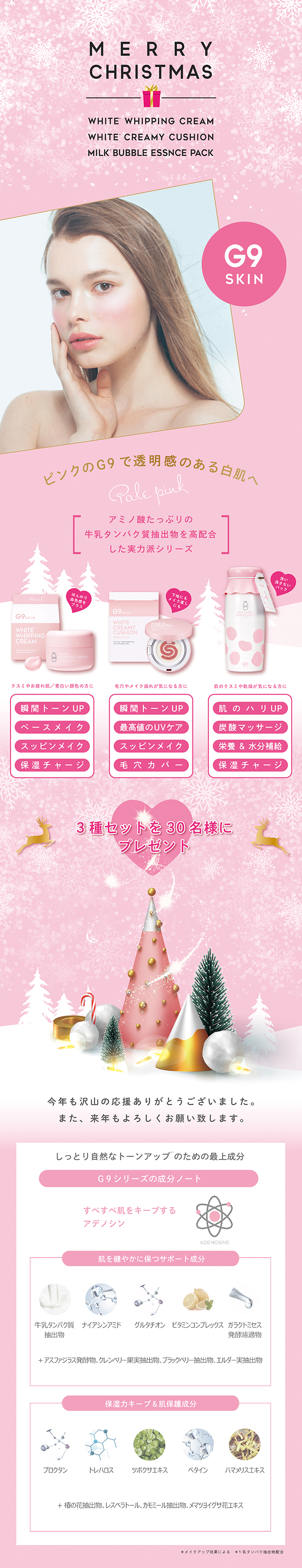 【G9スキンの可愛いピンクシリーズ】 ㅤㅤㅤㅤㅤㅤㅤㅤㅤㅤㅤㅤㅤ ㅤㅤㅤㅤㅤㅤㅤㅤㅤㅤㅤㅤㅤ ㅤㅤㅤㅤㅤㅤㅤㅤㅤㅤㅤㅤㅤ ● WHITE CREAMY CUSHION ㅤㅤㅤㅤㅤㅤㅤㅤㅤㅤㅤㅤㅤ 塗って直ぐにトーンアップ! すっぴん・メイク前後もいつでも使え 毛穴・しみ・くすみをカバー。 紫外線もしっかりガードしてくれます。 ㅤㅤㅤㅤㅤㅤㅤㅤㅤㅤㅤㅤㅤ パッケージがピンクなので 可愛いしテンション上がる〜💕 お肌のトーンアップ効果すごいです✨ ㅤㅤㅤㅤㅤㅤㅤㅤㅤㅤㅤㅤㅤ ㅤㅤㅤㅤㅤㅤㅤㅤㅤㅤㅤㅤㅤ ● WHITE WHIPPING CREAM ピンク (ウユクリーム) ㅤㅤㅤㅤㅤㅤㅤㅤㅤㅤㅤㅤㅤ ふっくら愛されピンクのトーンアップウユクリーム。 塗って直ぐにトーンアップ。 話題のウユクリーム(牛乳クリーム)は、 毛穴・しみ・くすみをカバー。 ㅤㅤㅤㅤㅤㅤㅤㅤㅤㅤㅤㅤㅤ テクスチャーな生クリームみたい。 色もピンクでお肌のトーンアップ、 くすみを飛ばしてくれます✨ ㅤㅤㅤㅤㅤㅤㅤㅤㅤㅤㅤㅤㅤ ㅤㅤㅤㅤㅤㅤㅤㅤㅤㅤㅤㅤㅤ ● G9 MILK BUBBLE ESSENCE PACK #PLAIN ㅤㅤㅤㅤㅤㅤㅤㅤㅤㅤㅤㅤㅤ G9シリーズから洗い流さない バブルエッセンスパックが登場! 肌になじませると、しゅわしゅわ 細かいミルクバブルがはじける新感覚。 ㅤㅤㅤㅤㅤㅤㅤㅤㅤㅤㅤㅤㅤ お肌に当てると、しゅわしゅわと 泡になっていきます。 お顔だけでなく体にも使いました😌 乾燥肌ももちもち肌に。 ㅤㅤㅤㅤㅤㅤㅤㅤㅤㅤㅤㅤㅤ ㅤㅤㅤㅤㅤㅤㅤㅤㅤㅤㅤㅤㅤ ㅤㅤㅤㅤㅤㅤㅤㅤㅤㅤㅤㅤ #G9SKIN #G9ウユクリームピンク #G9バブルパック #泡の美容液 #G9ウユクッション #瞬間白肌 #monipla #GRinc_fan 2021/01/12