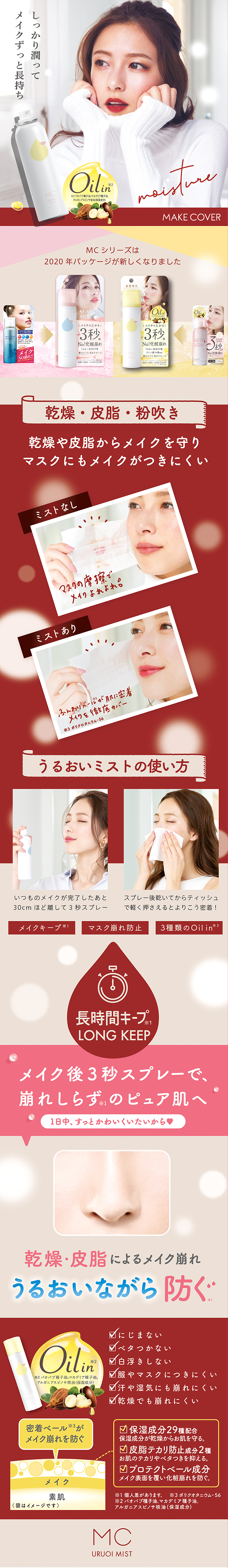 メイクカバーうるおいミスト オイルイン(2020リニューアル版) 【期間限定]冬の乾燥からメイクと素肌をしっかり守る保湿力アップのフィックスミスト。 肌に嬉しいうるおい成分を28種類配合し、更に14種類のアミノ酸も配合。乾燥しがちな季節に嬉しいしっとりタイプです。 メイクの上から3秒スプレーで、メイク仕立てを長時間キープ! 皮膜成分、保湿成分、皮脂抑制成分配合で、乾燥によるメイク崩れ・皮脂によるメイク崩れをWブロックします。 白浮きやベタつきしないのも人気の秘密です。 マスクや服にも化粧移りしにくいので、マスクが貴重なこの時期にも大活躍。メイクもマスクもキレイなまま長持ちします。ほのかに香る、優雅なユリの香り。 2020年8月パッケージリニューアル。 レビュー数 : 156 |