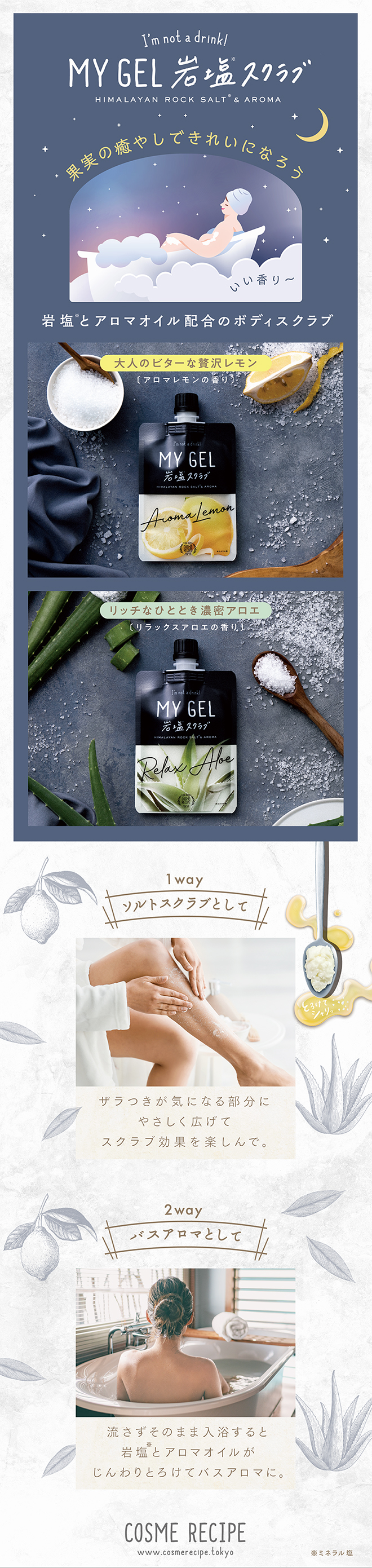 𓃟ﻌﻌﻌ⸜❤︎⸝� � MY GEL 岩塩スクラブ � � 大人のビターな贅沢レモン🍋� � 肌にもお湯にも溶ける2WAYスクラブ✨✨� ミネラル豊富な岩塩配合でお肌すべすべ💕� � とってもいい香りでバスタイムが� 癒しの時間に♨️� � 滑らかなテクスチャだよ!� ザラっとしているけど肌に乗せると� 体温で徐々に溶けるよ☺️� やさしーくマッサージしていくと� ツルツルになるの😳� 流してもいいしそのまま湯船に� 入る事もできるよ☺️� � マッサージによる血行促進ですっきり引き締めケアも� 出来ちゃうから私は半身浴しながら二の腕を� マッサージしてるよ♪� � 9種類の保湿成分、アーモンド油、ホホバ種子油、� オリーブ果実油なども配合されているよ😆� � � アロマレモンのほかにもリラックスアロエの� 香りもあってこちらも気になる✨✨� � � #PR #GR株式会社 #コスメレシピ #いい香り #岩塩スクラブ #ソルトスクラブ #バスアロマ #角質ケア #monipla #GRinc_fan 2021/04/22