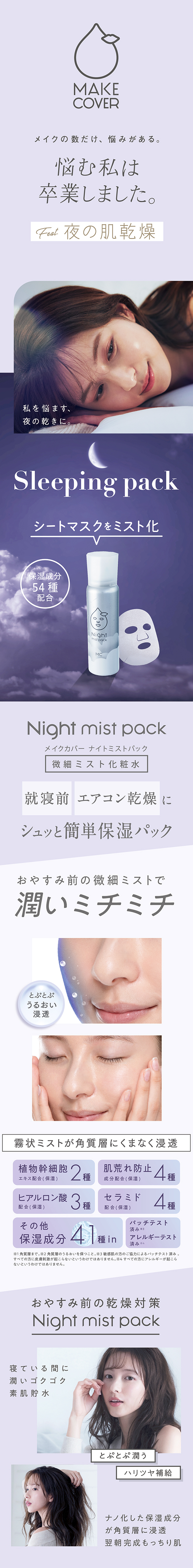 ナイトパック・日中の乾燥対策・洗顔後のうるおい補給に。美肌成分が豊富でナノ化された保湿成分もたっぷり配合し、寝ている間の無防備な肌を翌朝までしっかり保湿するから朝のメイクのりも抜群です。