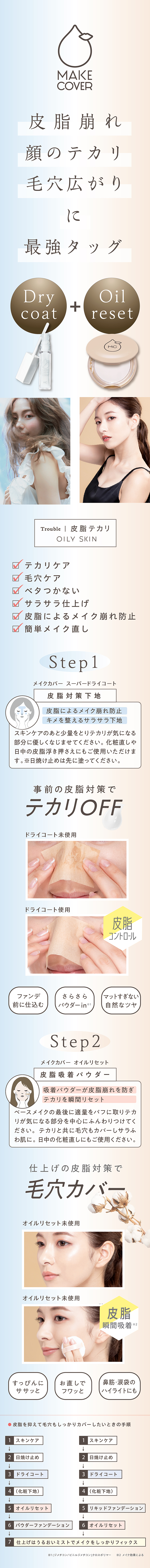 また、皮脂吸着成分としてタルク、シリカの2成分を配合。メイクカバー製品の特徴である被膜成分も配合(メタクリル酸メチルクロスポリマー)