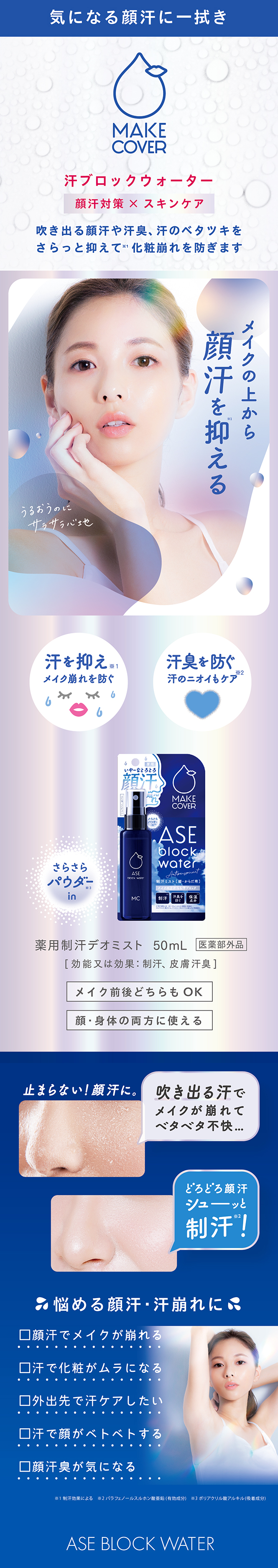 被膜成分配合で化粧崩れも防止。さらさらパウダ配合によりさらっとした使用感が続きます。ひんやりとした使用感も汗かきさんには嬉しい!メイクの上からでも使用できます。