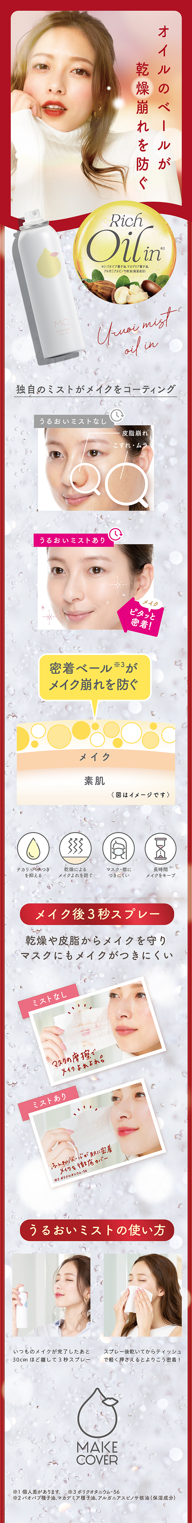 メイクカバーうるおいミスト オイルイン(2020リニューアル版) 【期間限定]冬の乾燥からメイクと素肌をしっかり守る保湿力アップのフィックスミスト。 肌に嬉しいうるおい成分を28種類配合し、更に14種類のアミノ酸も配合。乾燥しがちな季節に嬉しいしっとりタイプです。 メイクの上から3秒スプレーで、メイク仕立てを長時間キープ! 皮膜成分、保湿成分、皮脂抑制成分配合で、乾燥によるメイク崩れ・皮脂によるメイク崩れをWブロックします。 白浮きやベタつきしないのも人気の秘密です。 マスクや服にも化粧移りしにくいので、マスクが貴重なこの時期にも大活躍。メイクもマスクもキレイなまま長持ちします。ほのかに香る、優雅なユリの香り。 2020年8月パッケージリニューアル。 レビュー数 : 156 |