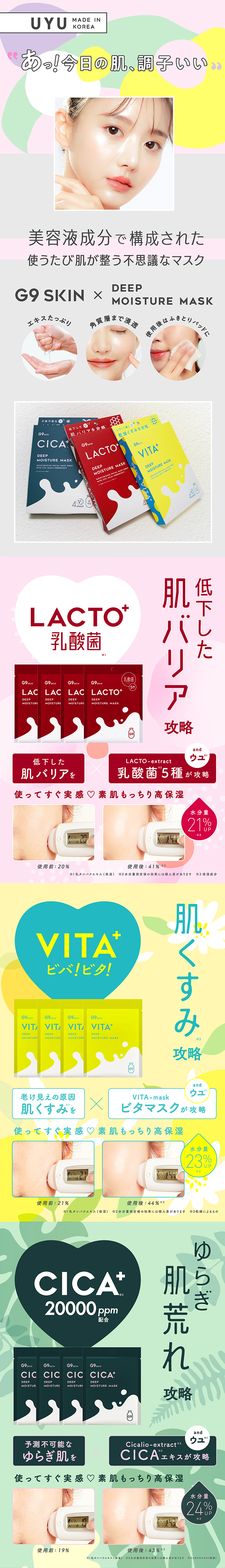 . 肌環境、後略マスク❣️ G9 LACTO+ DEEP MOISTURE MASK ラクトプラスディープモイスチャーマスク プチプラでなんどもリピート しているこちらのマスク✨ ウユ成分(乳タンパクエキス)配合で 乾燥によってくすんで見える肌に しっかりうるおいを与えてくれ、 明るい印象へと導いてくれます☺️ シートがぷるぷるで、肌にぴたっと 密着してくれ、 たっぷり染み込んだ乳酸菌成分5種が、 ぐーんと角質層まで浸透してくれ、 肌環境を整えてくれます🫶 17種類のアミノ酸や CICA(ツボクサエキス:保湿)成分配合で 肌荒れや乾燥肌対策にもピッタリ! 最近、肌寒くなりお肌も乾燥しがちで お肌上がりにパックすると 翌朝、お肌がぷるぷるで 化粧のノリや肌艶がアップして とっても使い心地いいですよ〜✨ お値段もプチプラで、 使い心地もいいので お気に入りのマスクです☺️ お店で見かけたら、是非 手にとってみてください♡ #PR #GR株式会社 #CICAマスク #g9facemask #肌荒れくすみ対策マスク #肌バリア強化マスク #g9ウユエキス #トーンアップ #monipla #GRinc_fan #プチプラコスメ#乾燥肌対策#美肌になりたい #スキンケア好きな人と繋がりたい #美容好きな人と繋がりたい#乾燥肌にオススメ #followme 2022/11/05