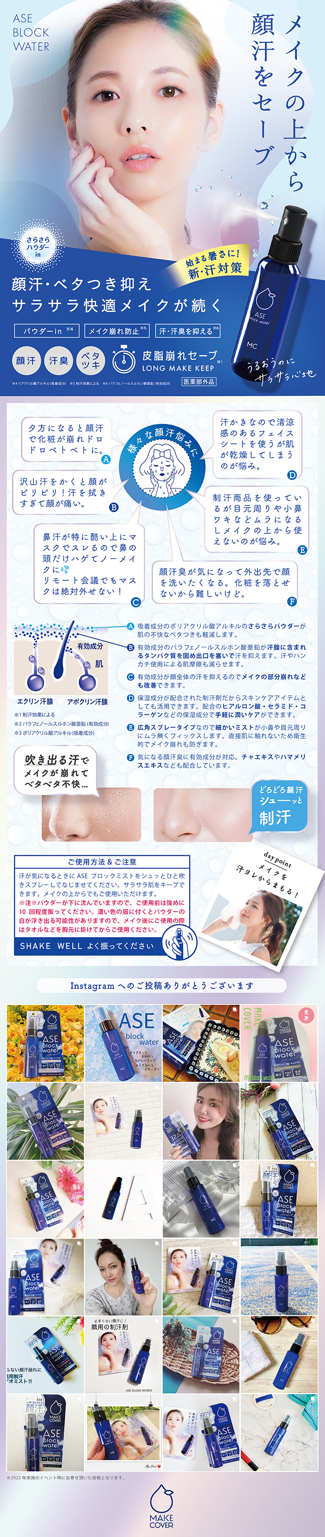 被膜成分配合で化粧崩れも防止。さらさらパウダ配合によりさらっとした使用感が続きます。ひんやりとした使用感も汗かきさんには嬉しい!メイクの上からでも使用できます。