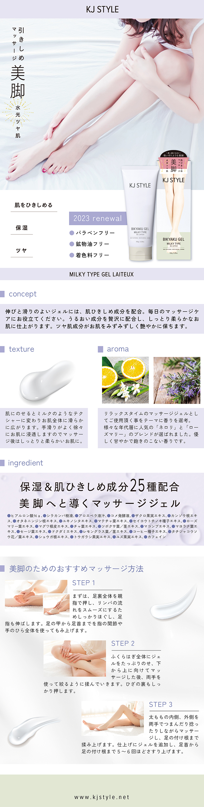 理想的な美脚ラインを目指すためのマッサージジェル。韓国と日本の女性本来の美しさを導き出すブランドコンセプトを韓国モデル協会と共有して開発したKJビキャクジェルのバージョンアップ版です。成分は勿論テクスチャーや使用感にもこだわったジェルクリームです。1日1回、肌にすり込むように5分程度マッサージしてください。美脚&水光肌に仕上げる引き締め+保湿成分を25種配合し肌のひきしめ&保湿&ツヤを同時に叶えます。ネロリとローズマリーをベースにしたやさしいハーブの香りです。