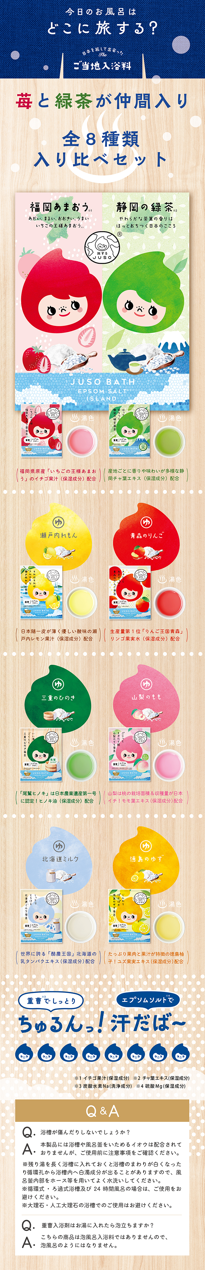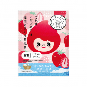 旅するJUSOちゃんのご当地入浴剤シリーズにこれぞいちごの王様「福岡のあまおう」が仲間入り。重曹(炭酸水素Na:洗浄成分)とエプソムソルト(硫酸Mg:保湿成分)有機ゲルマニウム配合でお肌の汚れを浮かせて汗がじんわり。スベスベちゅるんな素肌へ導きます。苺風呂/湯色は乳白ピンクです。※イチゴ果汁(保湿成分)配合