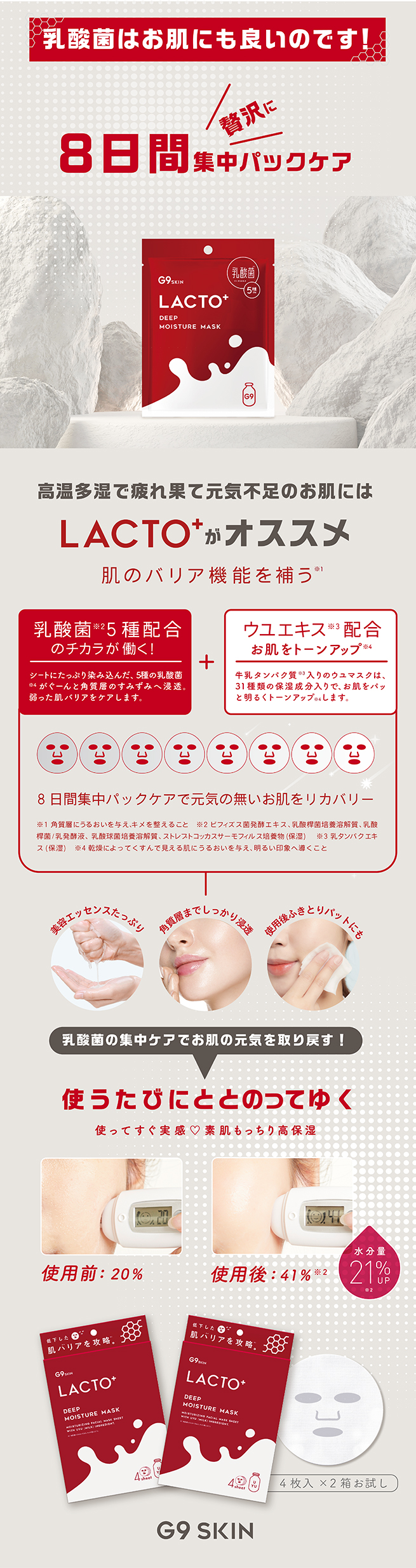 シートにたっぷり染み込んだ乳酸菌成分5種が、ぐーんと角質層まで浸透し肌環境を整えます。また、17種類のアミノ酸入りで、肌にうるおいを与えます。