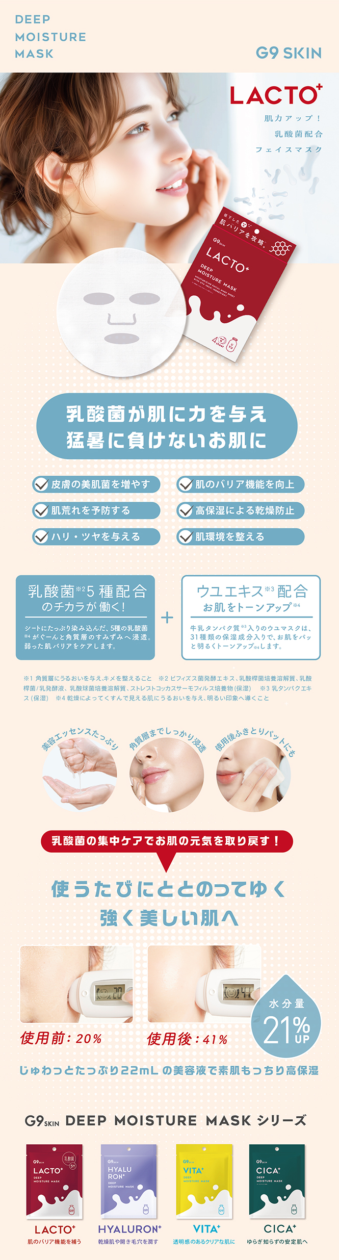 シートにたっぷり染み込んだ乳酸菌成分5種が、ぐーんと角質層まで浸透し肌環境を整えます。また、17種類のアミノ酸入りで、肌にうるおいを与えます。