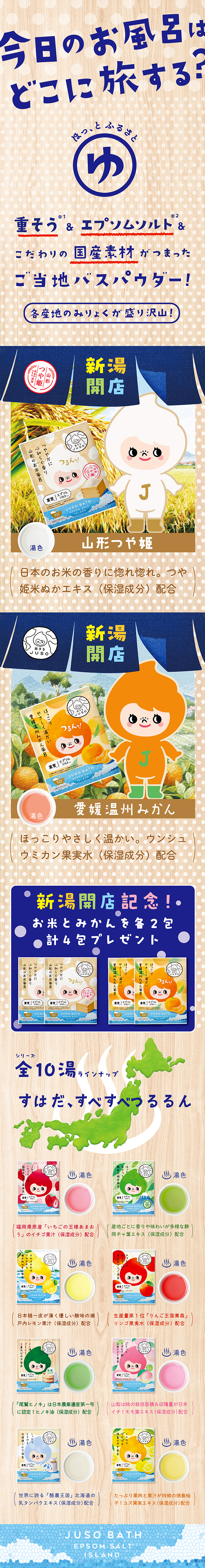 旅するJUSOちゃんのご当地入浴剤シリーズに『温州みかんはほっこり旅するJUSOちゃんのご当地入浴剤シリーズにやさしく温かい』が仲間入り。重曹(炭酸水素Na:洗浄成分)とエプソムソルト(硫酸Mg:保湿成分)有機ゲルマニウム配合でお肌の汚れを浮かせて汗がじんわり。スベスベちゅるんな素肌へ導きます。みかん風呂/湯色は乳白オレンジです。※みかんの香り