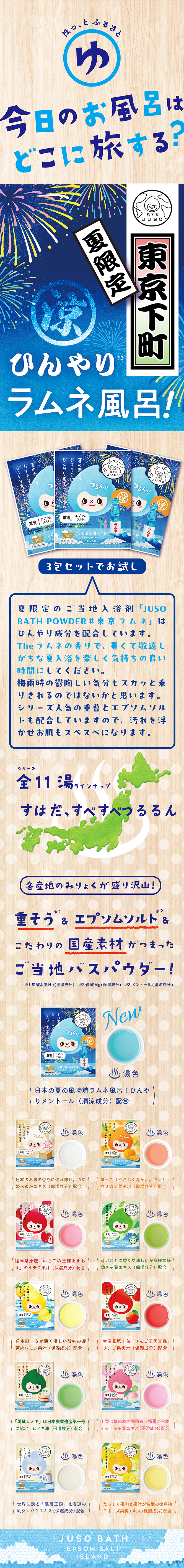 旅するJUSOちゃんのご当地入浴剤シリーズに『夏の楽しさおすそ分けひんやり東京ラムネ』が仲間入り。重曹(炭酸水素Na:洗浄成分)とエプソムソルト(硫酸Mg:保湿成分)有機ゲルマニウム配合でお肌の汚れを浮かせて汗がじんわり。スベスベちゅるんな素肌へ導きます。ラムネ風呂(冷感)/湯色は水色です。※ラムネの香り