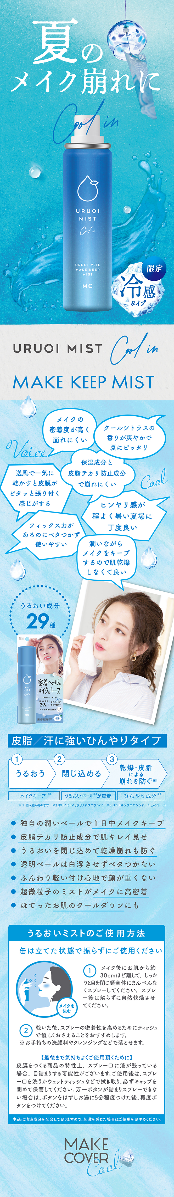 メイクキープ効果UP(従来品比較)&軽い着け心地となってリニューアル!・化粧崩れを防ぐプロテクトベール成分が肌表面に透明ベールのような膜を形成。・皮脂テカリ防止成分2種配合で皮脂による化粧崩れを防止。・肌に嬉しいうるおい成分を配合。・29種のうるおい成分配合。・シリコンフリー・無鉱物油・パラベンフリー・無香料。スプレー後は密着ベールがうるおいを閉じ込め崩れにくく白浮きやべたつきしないのが特徴です。クールシトラスの香り。