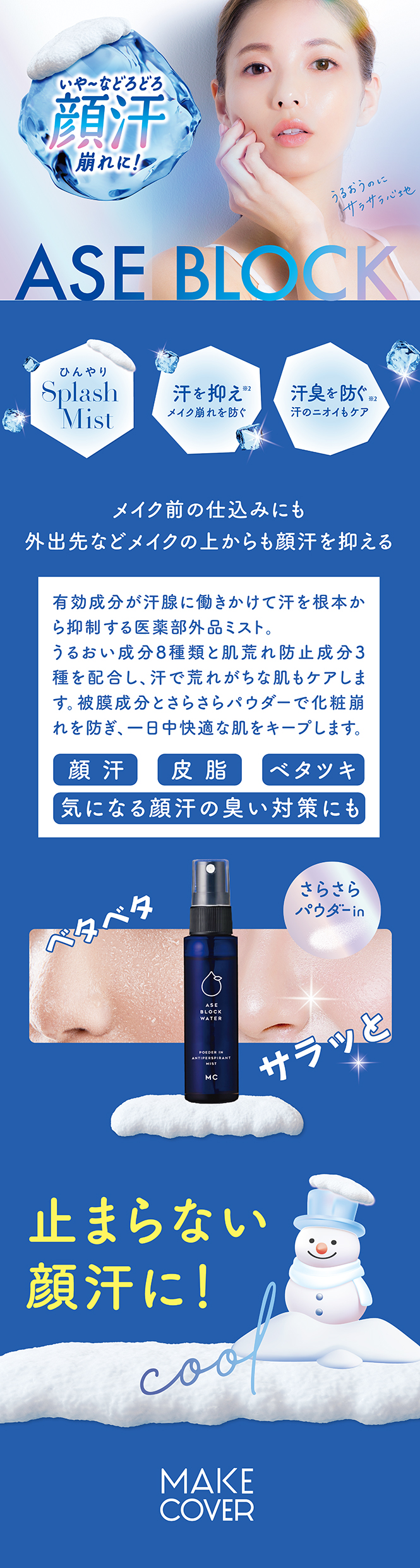 さらさらパウダ配合によりさらっとした使用感が続きます。更にクール成分新配合でひんやりとした使用感も、汗かきさんには嬉しい新処方です