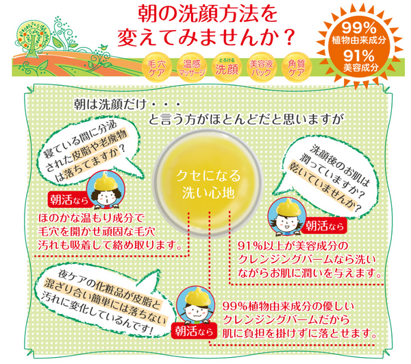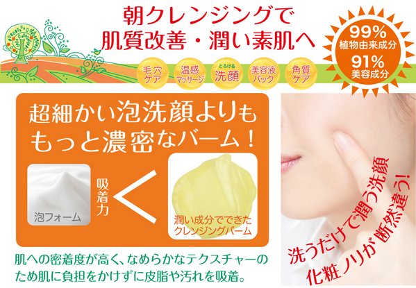 2015年4月1日より全国バラエティーショップにて販売開始!!! 99%植物由来成分 91%美容成分で出来ているクレンジングバームなら朝の洗顔中に潤いを補給。 寝ている間に分泌された皮脂や老廃物、夜ケアで酸化した化粧品も濃密なバームが吸着し絡めとります。 保湿成分による温感マッサージで毛穴を開かせ、肌をやわらかくほぐすので、お肌に負担をかけずに毛穴汚れもスッキリ落とします! 朝活クレンジングバームで化粧ノリの違いを実感してください。 清々しい朝に最適な爽やかなオレンジの香りです。 http://www.dr-coltd.jp/asakatsu.html レビュー数 : 34 |