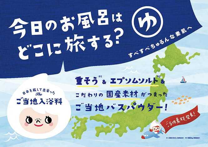 旅するJUSOちゃんのご当地入浴剤シリーズのトップバッターのひとつ北海道産「ミルク」。重曹とエプソムソルト&国内素材のしっとりミルクでちゅるんちゅるんなお肌に導きます。ミルク風呂:乳白色。※ミルクの香り