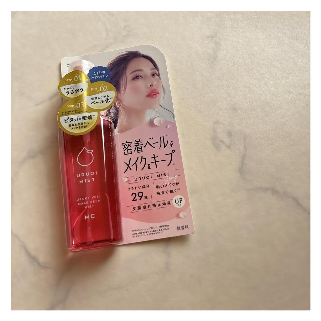 メイク後にうるおいミストを顔から少し離してスプレーすると、密着ベールがメイクをキープ❣️