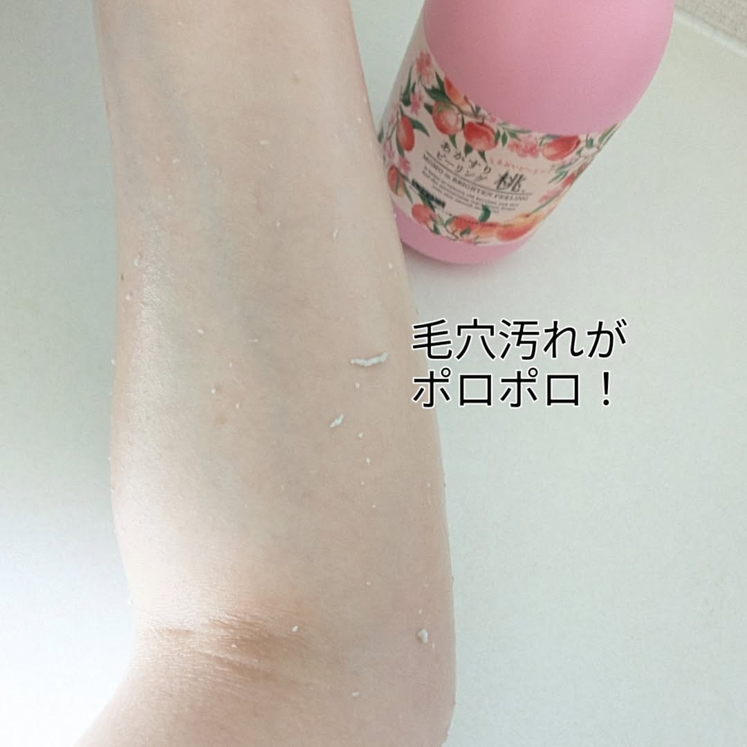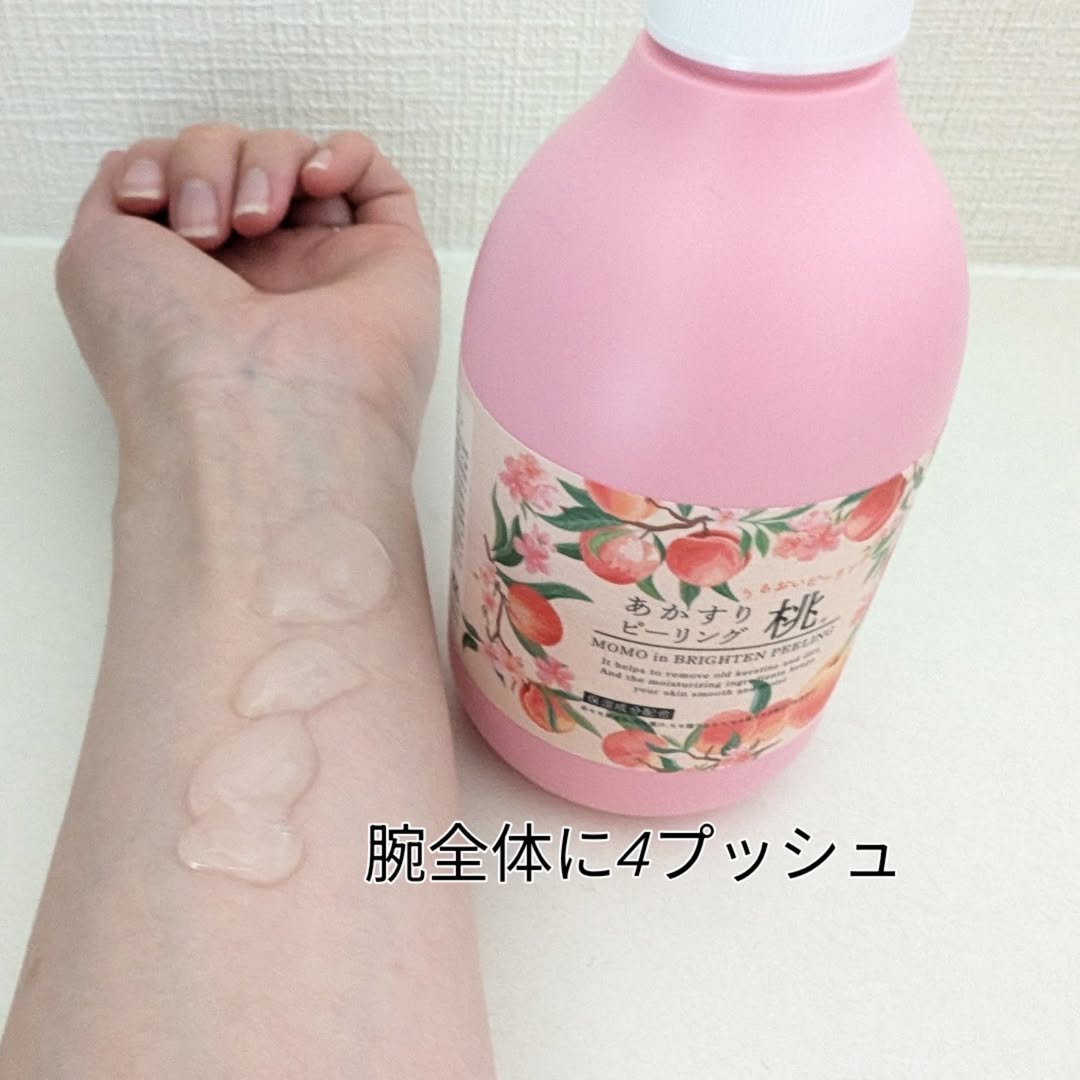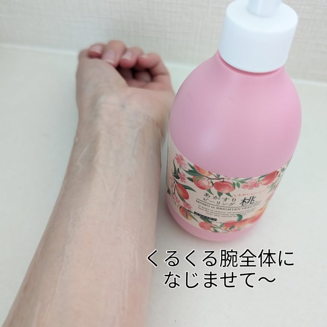 古い角質、気になるくすみ(不要な角質や汚れによる)・ざらつきにあかすりピーリング。ピーリング後の肌をケアする保湿成分「ヒアルロン酸」「コラーゲン」「プラセンタエキス」「ナイアシンアミド」を配合。たっぷり使える大容量290mlのポンプタイプなので顔にも全身にもご使用頂けます。特に湯船に浸からないシャワー派の方は垢がたまりやすいのでおすすめです。お風呂場でのご使用時は水気を拭き取ってからご使用ください。 華やかで瑞々しい桃の香りでリラックスしながらピーリングケアができます。