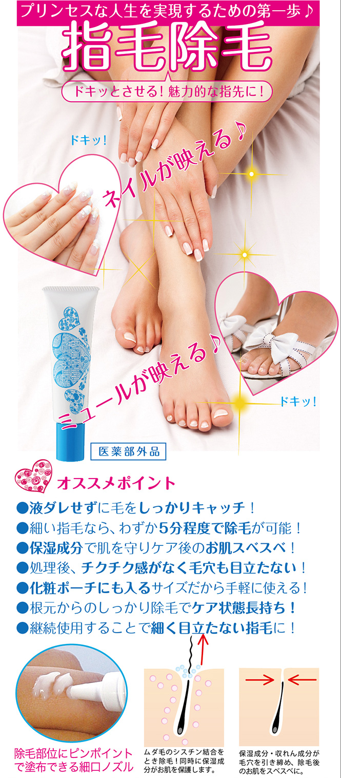 株式会社ディーアール様の指毛用の除毛剤【プリンセスフィンガーヘアリムーバー】をご紹介させていただきます 細かい部位の除毛に最適な薬用リムーバーが登場スマホの操作や握手、名刺交換など、指はいつも他人の視線にさらされています綺麗な指の持ち主は、やっぱりイメージが良いもの「ハッ!」と気付… 2015/06/30