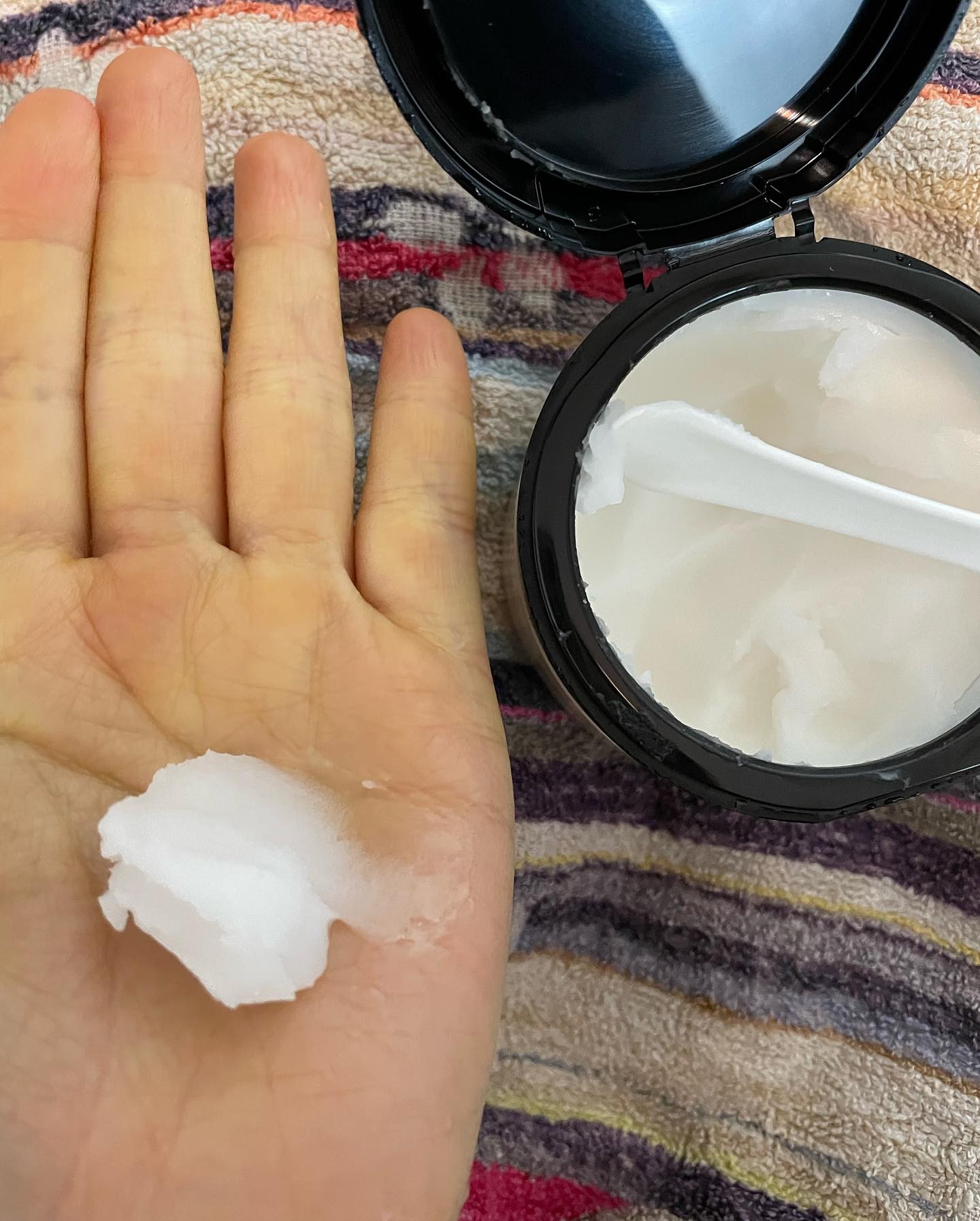 スパチュラもしっかり入っているので衛生的にもいいです。少し硬めのバームですがスパチュラでとりやすく肌に乗せるととろけるのがすごく早くてじんわりメイクになじみながらすぐにオイル状に変わります。ウォータープルーフのアイラインも、スルっと落ちるのでゴシゴシしなくて簡単に落ちます。徐々に水を加えることで乳化してしっかりクレンジングできます。