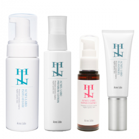 大人ニキビとホルモンバランスの関係に着目して開発されたドクターズコスメ・HINアクネスラボの基礎化粧品4点セットです。(洗顔料・化粧水・美容液・保湿ジェル)