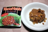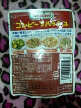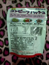 原材料 : 牛肉、野菜(じゃがいも『遺伝子組換え不分別』、たまねぎ)、醤油、香辛料、コーンスターチ、砂糖、食塩、調味料(アミノ酸等)、(原材料の一部に小麦、乳を含む)