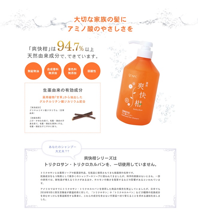アミノ酸シャンプー爽快柑が「薬用」になってグレードアップ!!生薬・甘草由来の有効成分、グリチルリチン酸ジカリウムを配合。ふけやかゆみ、毛髪・頭皮の汗臭を防ぎ、清浄に健やかに保ちます。ノンシリコン、石油系洗浄剤不使用、無香料、無着色、弱酸性。まずはお試しサイズ150mlからどうぞ。【効果・効能】ふけ・かゆみを防ぐ。毛髪・頭皮の汗臭を防ぐ。毛髪・頭皮を清浄にする。毛髪・頭皮をすこやかに保つ。