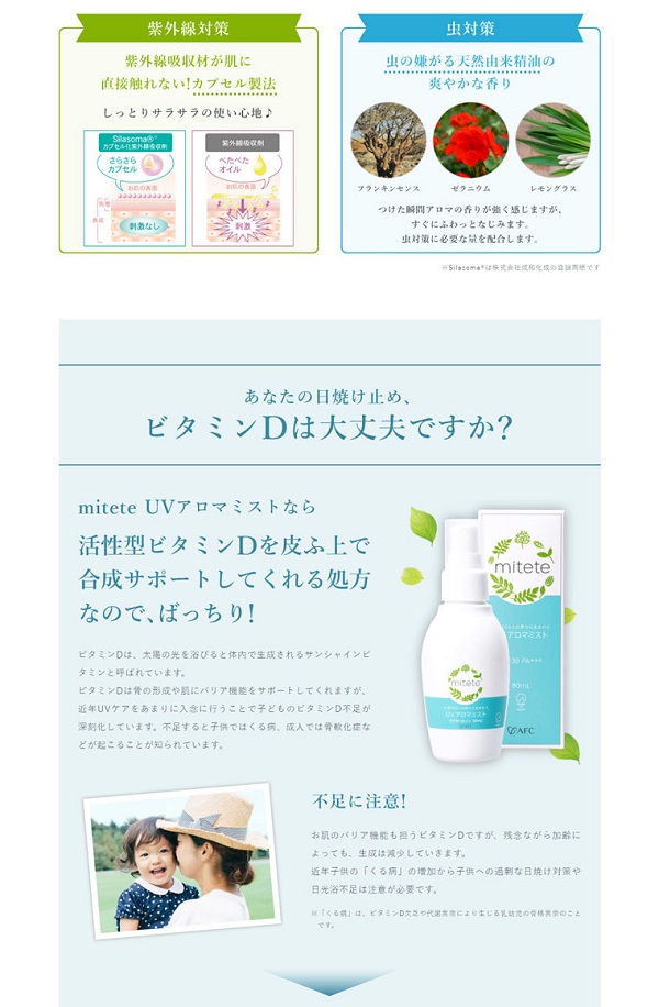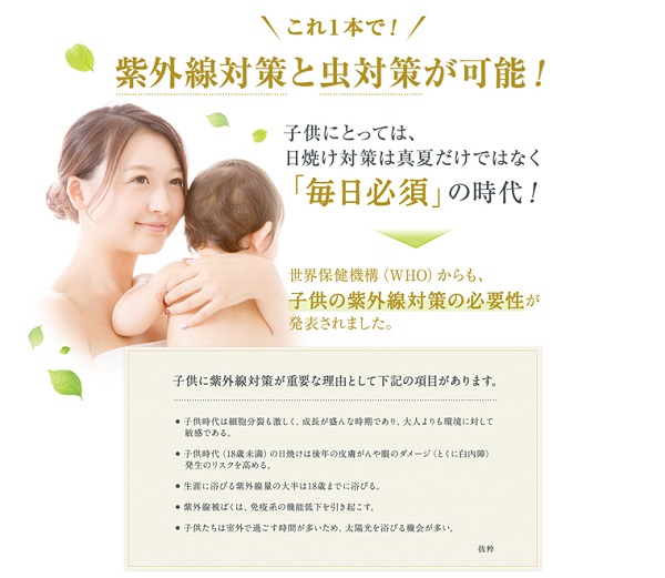 虫の苦手なアロマオイルを配合したアウトドアシーズンにぴったりな日焼け止めミスト。保湿力に優れ、日光浴不足・エイジングで失われがちなビタミンD生成も補助できる多機能な1本です。無添加処方で赤ちゃんやお肌の弱い方にも安心してお使いいただけます。 香料・合成着色料・鉱物油・パラベン・ディート