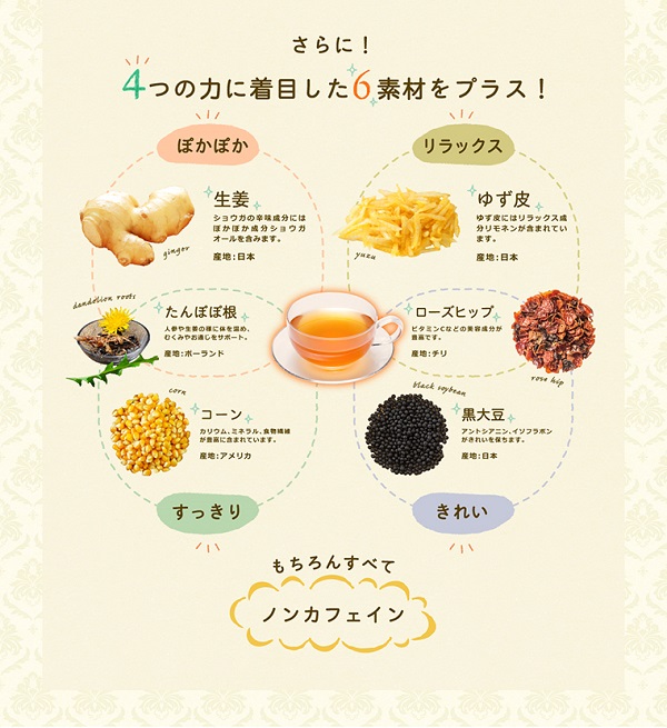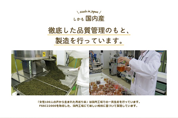 「月巡り茶」には生姜やタンポポ根など女性のめぐりを助けるとされる成分を配合しました。