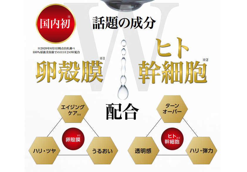 話題の「卵殻膜」×「ヒト幹細胞」原液のW配合美容液です。